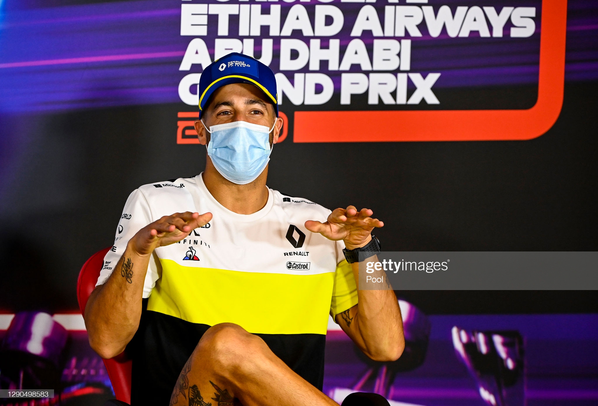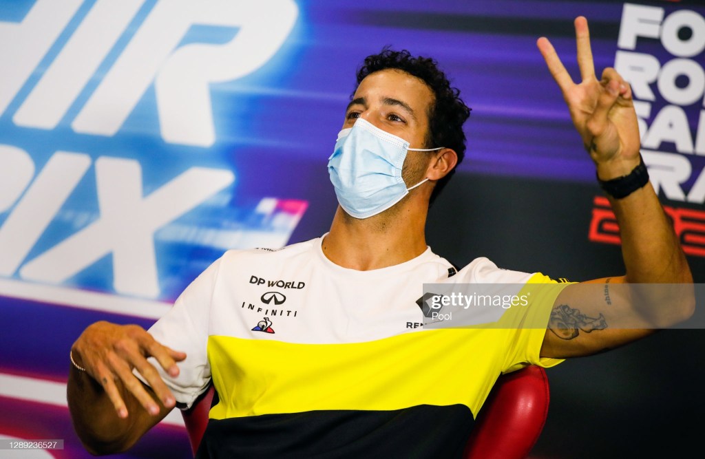 BAHRAIN, BAHRAIN – DECEMBER 03: Daniel Ricciardo of Australia and Renault Sport F1 talks in the Drivers Press Conference during previews ahead of the F1 Grand Prix of Sakhir at Bahrain International Circuit on December 03, 2020 in Bahrain, Bahrain. (Photo by Florent Gooden – Pool/Getty Images)