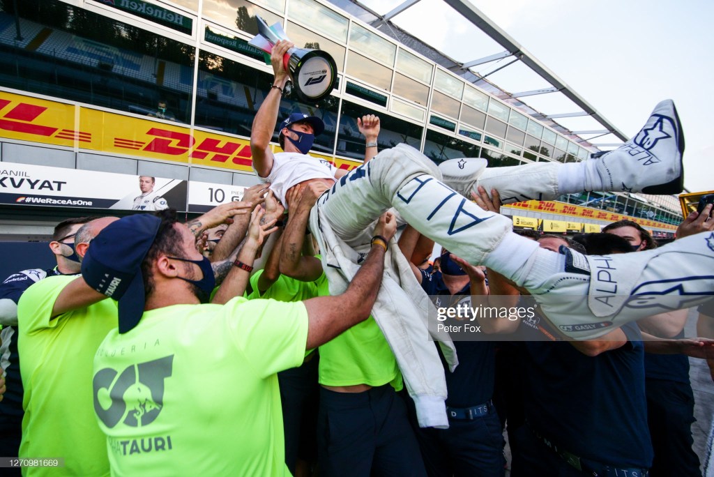 MONZA, ITALY – SEPTEMBER 06: Pierre Gasly of Scuderia AlphaTauri and France celebrates with the team after winning the F1 Grand Prix of Italy at Autodromo di Monza on September 06, 2020 in Monza, Italy. (Photo by Peter Fox/Getty Images)